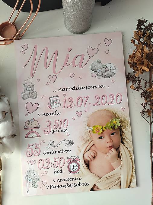 Veľmi obľúbená tabuľa s údajmi o narodení dieťatka, s fotkou alebo s obrázkom, možnosť výberu obrázku. Krásny darček k narodeniu bábätka, ku krstinám, dekorácia do detskej izbičky. Odosielam po prijatej platbe :)